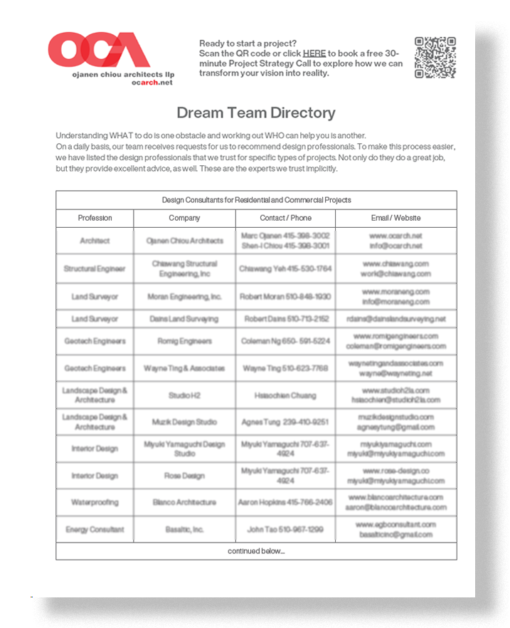 Architecture is a team sport. After more than 25 years working on projects of varying size and complexity both locally and internationally, we have realized that successful design and construction projects always depend on a reliable team of professionals who can bring their unique perspectives and expertise to the table. We are offering this select list of trusted consultants and contractors in the Bay Area who provide services that align with our rigorous quality standards and expectations including structural engineer, surveyors, civil engineers, landscape designers, interior designers, energy and waterproofing consultants, and contractors.